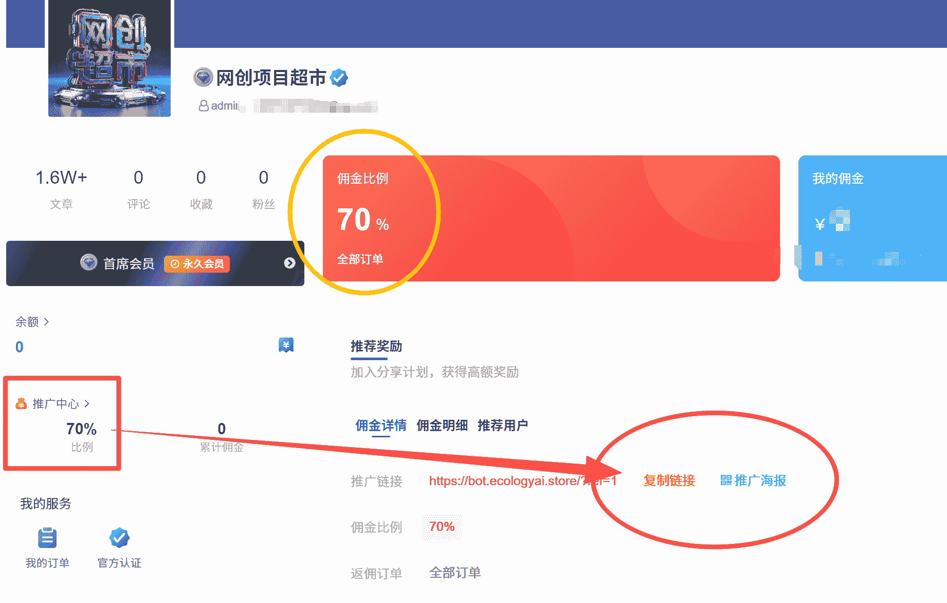 ☁ 在用户中心-推广中心-复制链接或推广海报